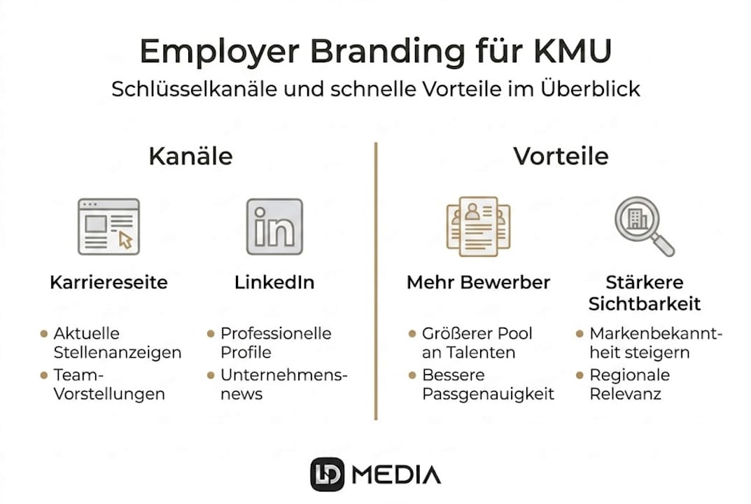 Karriereseite, LinkedIn und Google Business Profile funktionieren für KMU besonders gut, ergänzt durch authentische Einblicke auf Instagram oder TikTok, die Nähe und Unternehmenskultur transportieren.