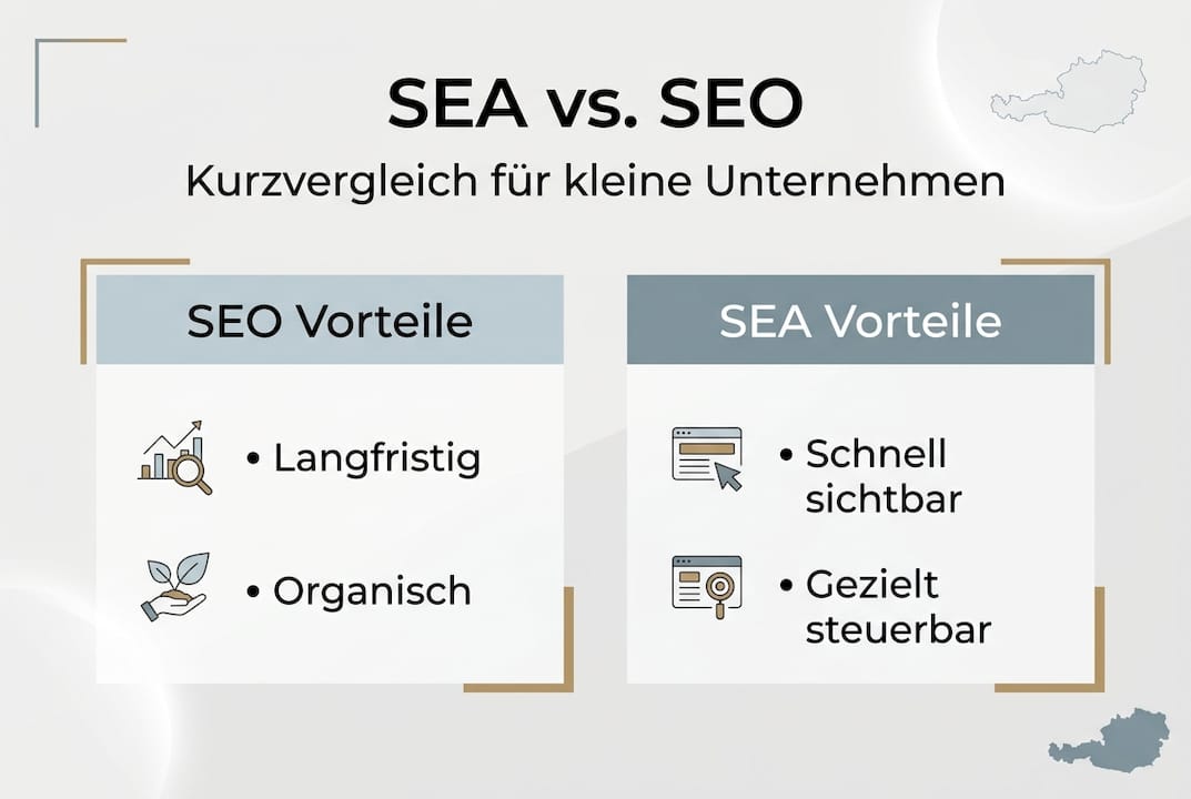 Viele Kleinunternehmer glauben, dass Suchmaschinenwerbung nur etwas für große Konzerne mit riesigen Marketingbudgets sei. Doch diese Annahme kostet österreichische KMU täglich wertvolle Kundenanfragen. SEA ist bezahlte Werbung in Suchmaschinen, die sofortige Sichtbarkeit erzeugt und ermöglicht es selbst kleinen Betrieben, gezielt potenzielle Kunden zu erreichen. Dieser Artikel zeigt Ihnen verständlich und praxisnah, wie Sie SEA effektiv für Ihr Unternehmen einsetzen können, ohne sich in technischen Details zu verlieren oder Ihr Budget zu verschwenden.