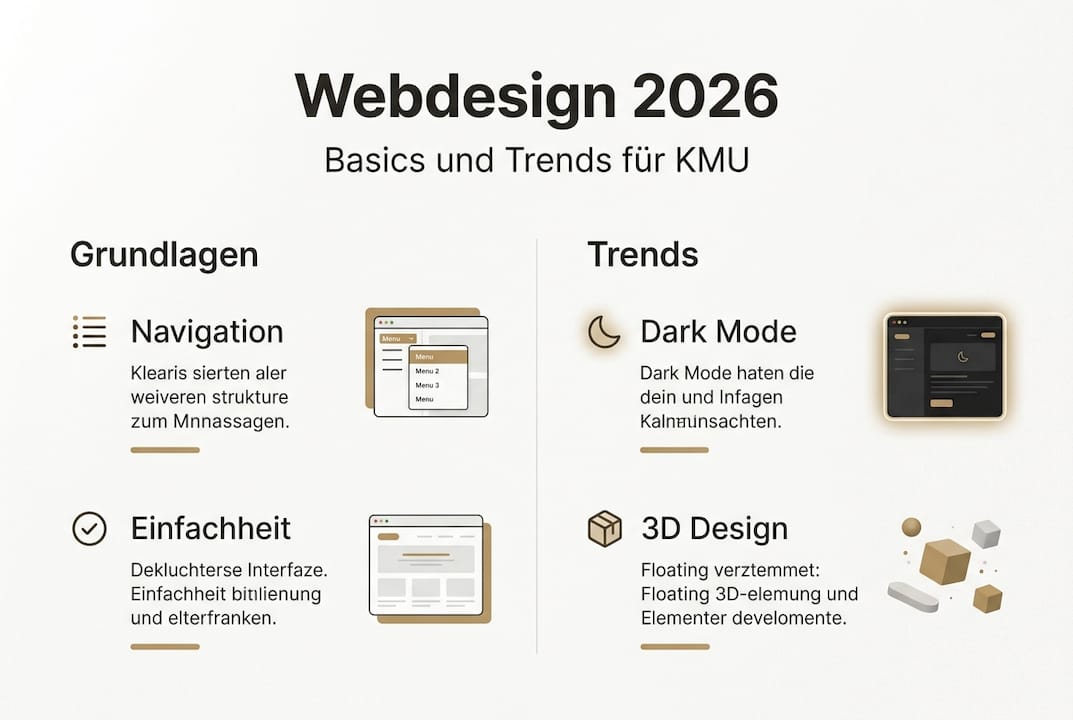 Der Webdesign-Markt überschwemmt KMU ständig mit neuen Trends. KI-generierte Layouts, 3D-Elemente, Parallax-Scrolling, Micro-Animations und Dark Mode dominieren die Diskussionen. Die Wahrheit ist: Fokus auf zeitlose Basics wie Schnelligkeit und Usability ist wichtiger als Hype-Themen. Trends kommen und gehen, aber grundlegende Prinzipien bleiben relevant.
