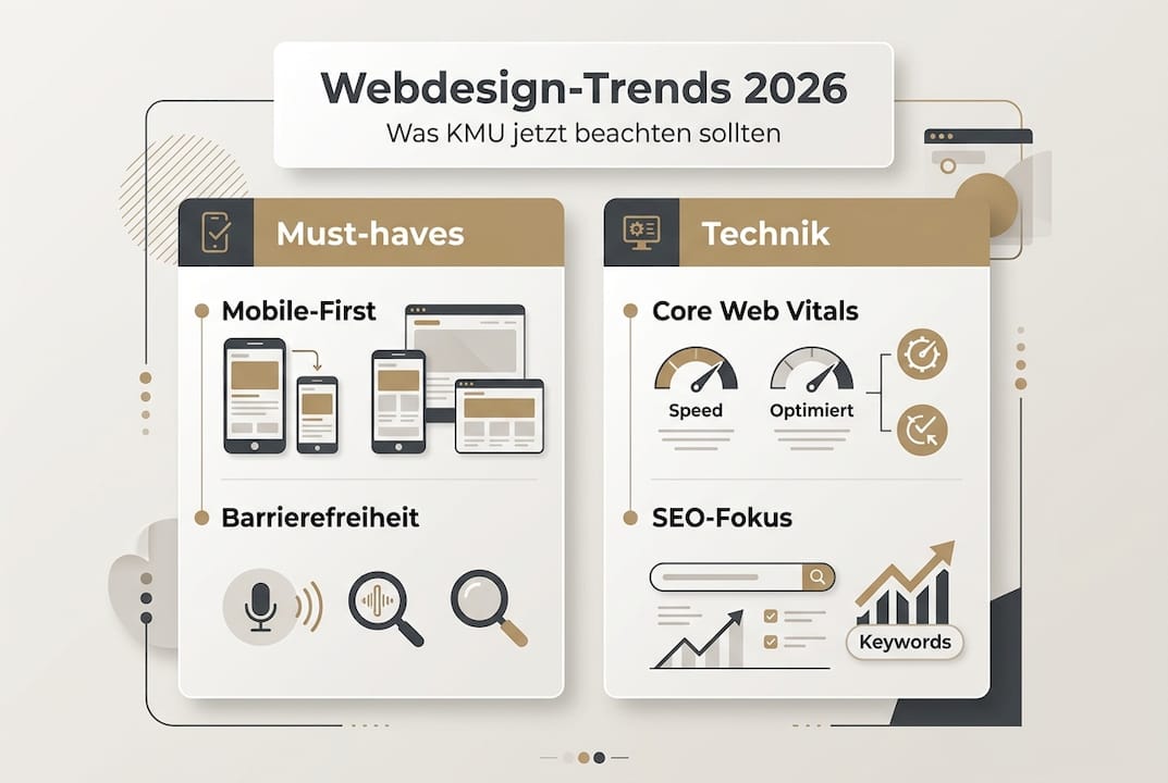 Die digitale Landschaft entwickelt sich rasant. Was 2024 noch optional war, ist 2026 Standard. Für KMU bedeutet das: Wer nicht mit aktuellen Anforderungen Schritt hält, verliert messbar an Sichtbarkeit und Wettbewerbsfähigkeit. Drei Faktoren dominieren die Webdesign-Anforderungen dieses Jahres.