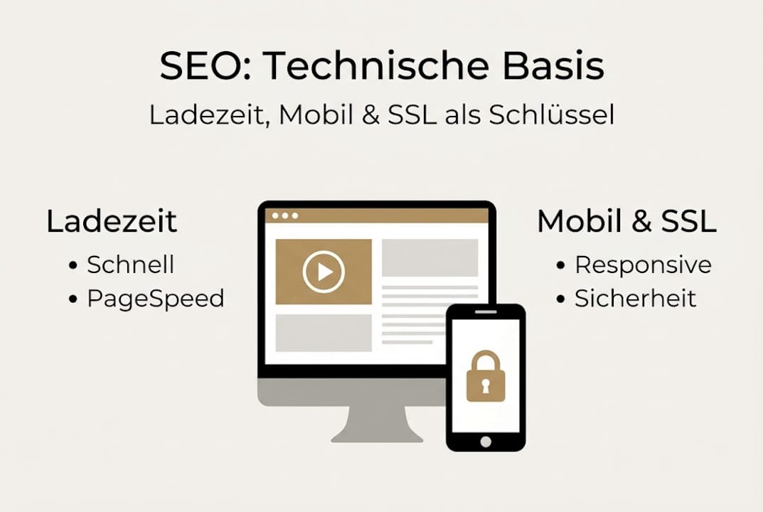 Die drei wichtigsten technischen Grundvoraussetzungen sind Ladezeit, Mobiloptimierung und SSL-Verschlüsselung. Eine Seite, die länger als drei Sekunden lädt, verliert im Schnitt über 50 Prozent ihrer Besucher, bevor sie überhaupt etwas gesehen haben. Mobiloptimierung ist heute Pflicht, da Google primär die mobile Version einer Seite bewertet. SSL bedeutet, dass deine Seite über "https" erreichbar ist, was Vertrauen bei Nutzern und Suchmaschinen schafft. Eine solide technische Basis ist essenziell für jeden SEO-Erfolg.